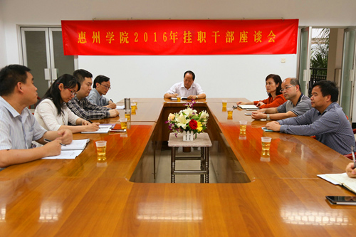 座谈会上,今年刚完成挂职任务回校的干部们畅谈了自己挂职期间的体会和收获。大家表示,挂职经历是一次难得的锻炼机会,是人生中一笔巨大的财富,通过锻炼,既开阔了视野,又拓展了思路。2013年至2016年挂任惠东县安墩镇石珠村党组织书记助理的刘团结同志谈到,他如何努力克服种种困难,在艰苦的条件下,积极融入村干部队伍和农民群众生活圈,顺利完成扶贫工作的经历;2015年挂任惠城区教育局副局长的张莉琼同志则围绕“勤奋敬业、恪尽职守;积极开拓、务求实绩;点燃激情,收获友谊”三部分讲述了自己的挂职经历,她用“三勤”概括了一年的挂职工作,即“勤动脑、勤动嘴、勤动腿”。“勤动脑”就是除了坚持搞好学习之外,开动脑筋,思考工作中存在的问题,思考解决问题的办法,思考创造性开展工作的思路等;“勤动嘴”就是多向上级和有关部门汇报,多听取基层情况汇报;“勤跑腿”就是坚持下基层,跑学校,检查了解基层第一线的情况;2015年挂任水务集团总经理助理的张闯老师认为,挂职锻炼使其进一步探索了政府、高校和企业三者的关系,同时,也促使其发挥自身的专业特长,让知识在实践中深化,让认知在锻炼中升华。座谈交流中,新选派到惠东县多祝镇新联村挂职的曹荣同志表示,听到大家的发言,收获颇丰,同时感觉责任重大,但一定不辜负组织信任,化压力为动力,努力去改善扶贫村的现状,尽职尽责地做好村第一书记的工作,圆满完成挂职任务。