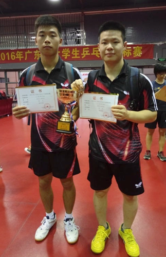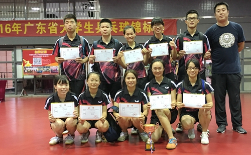本网讯 6月8日至6月12日,由广东省教育厅主办的2016年广东省大学生乒乓球锦标赛在华南理工大学(五山校区)体育馆举行。本届乒乓球锦标赛全省共有64支代表队参赛。我校乒乓球代表队共15人参加了甲组和乙A组的比赛。在体育系李林老师带领下队员们凭着精湛的技术、顽强的精神,获得乙A组(本、专科体育专业)男子双打冠军、女子双打亚军、女子双打第四名、混合双打第六名,乙A组团体总分亚军以及甲组(本科非体育专业)女子双打第七名。取得我院球类项目在省部级以上比赛中零的突破,个人冠军、团体亚军的好成绩。