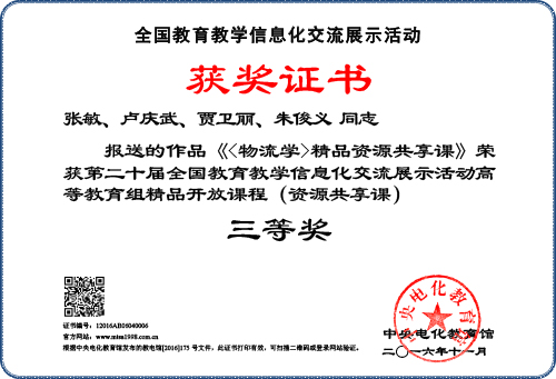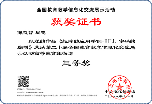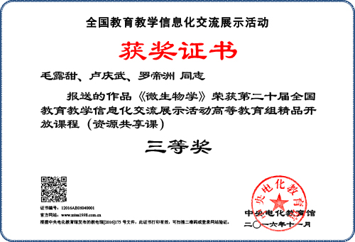 本网讯 近日,由中央电化教育馆主办的第二十届全国教育教学信息化交流展示活动(原全国教育教学信息化大奖赛)落下帷幕。由我校教育技术中心和人事处联合组织报送的教师参评作品,经济管理学院张敏老师主持的《物流学》精品资源共享课、数学与大数据学院陈益智老师的微课《矩阵的应用举例-HILL密码的编制》和生命科学学院毛露甜老师主持的《微生物学》精品资源共享课分别荣获三等奖。
