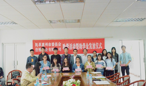据悉,“佳雅实业”助学金是由民革惠州市委员会发起、惠州市佳雅实业有限公司出资设立,自2011年启动至2014年,已经连续四年共计资助我院40名家庭经济困难学生顺利完成学业,资助金额已达12万元整。2015年起,佳雅实业有限公司加大了捐资助学的力度,受助学生人数从以往的10名增加到了30名,基金将每年为每位学生提供助学金,连续资助学子四年,帮助他们顺利完成大学学业。