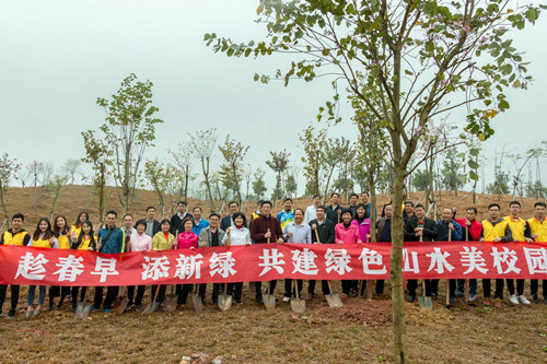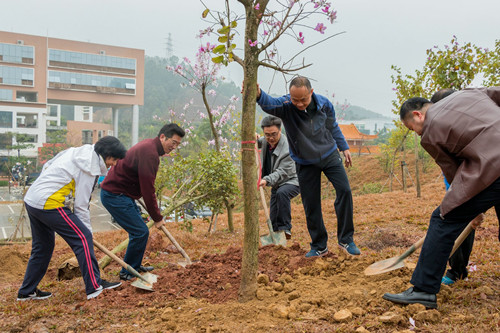 本网讯 水光潋滟晴方好,山色空蒙雨亦奇。在一年一度的植树节到来之际,3月11日上午,我校在丰湖园小山坡开展了“趁春早添新绿共建绿色山水美校园”植树活动。校长彭永宏,校党委副书记赵日兴,校党委副书记兼纪委书记李韶春,副校长刘国栋、罗川山等校领导与部分职能部门和二级学院负责人、青年志愿者、部分师生代表一起参加了活动。