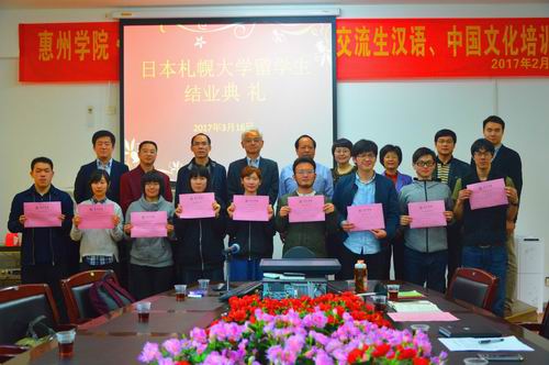 本网讯 2017年3月16日下午,日本札幌大学第四批交流生结业典礼在外国语学院会议室举行。校党委副书记赵日兴,日本札幌大学泉敬史教授,国际交流处合作处负责人,外国语学院党政负责人、老师代表及全体日本交流生出席了典礼。