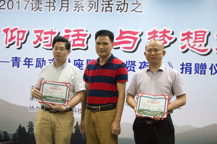 本网讯 为了营造良好的读书氛围,激励在校大学生勇于追求梦想,5月19日下午,我校与共青团惠州市委员会共同在图书馆报告厅举办了2017读书月系列活动之《近贤夜话》新书捐赠仪式暨青春励志讲座。学校副校长刘国栋,共青团惠州市委副书记邬文钧,惠州市作协主席陈雪,惠州报业传媒集团新闻热线工作室负责人,《近贤夜话》作者张元基,炜达科技股份有限公司董事长杨少伟,图书馆、学生处、团委、文学与传媒学院等主要负责人和300多名师生参加了本次活动。