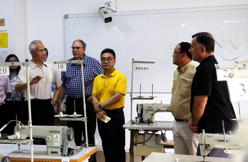 随后,来宾们参观了旭日广东服装学院。在服装学院负责人的引导下,来宾们参观了学生优秀作品展览区、成衣工艺室、电脑横机编织研发中心、学生电子商务工作室、T恤协同创新中心等实践教学场所。学院负责人给参访团详细讲解了该院校企联合办学、专业设置、人才培养、国际交流等办学特色及内容,得到了参访团的高度赞赏。该院还给每一名参访团的嘉宾赠送了一件学生设计的纪念T恤。