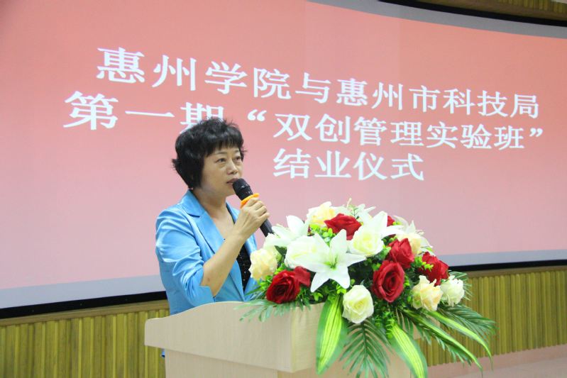 经济管理学院负责人首先致辞。她祝贺“双创班”顺利完成所有预期工作,圆满完成43名具有创新创业知识和背景的应用型经管人才的培养任务;对学校领导、惠州市科技局和企业界对“双创班”的重视与支持表示由衷的感谢,希望借助社会各界力量和资源,将“双创班”持续地办下去,努力越办越好,办出成绩,办出特色。