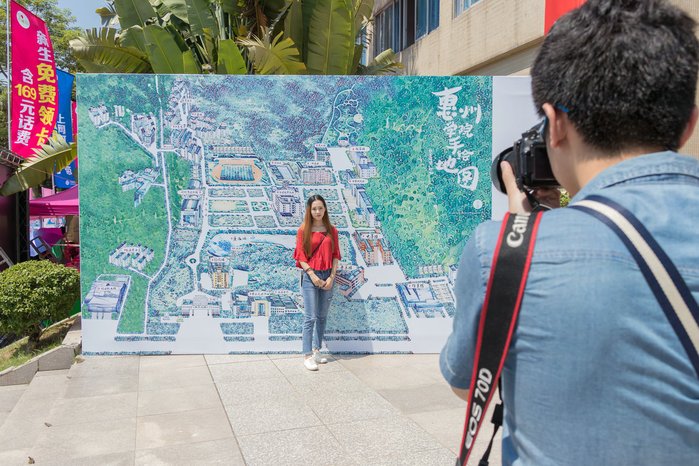 新生与学校地图合影留念