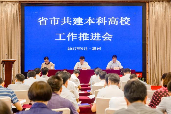本网讯 2017年9月20日上午,省市共建本科高校工作推进会在惠州召开。会议由省教育厅党组副书记、副厅长邢锋主持,黄宁生副省长出席会议并讲话。省教育厅、省财政厅有关负责同志,开展省市共建的9个地市政府负责同志,惠州学院刘晟书记、彭永宏校长、罗川山副校长和其他10所共建高校负责同志,惠城区、惠州市直有关部门负责人共约90人参加了会议。
