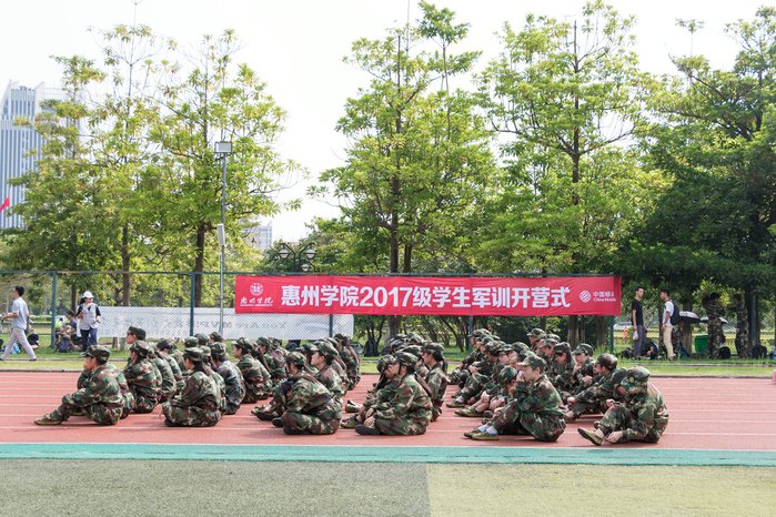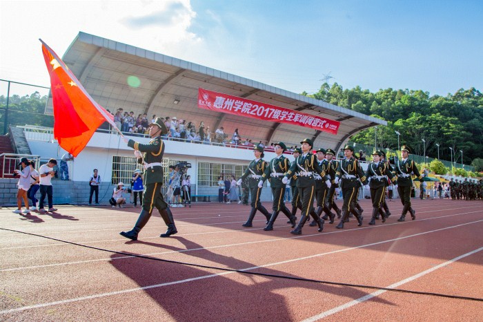 9月29日下午,学校田径场庄严肃穆、军旗飘扬,我校2017级新生军训闭营式在此隆重举行。学校校长彭永宏,党委副书记赵日兴,党委副书记兼纪委书记李韶春,副校长赖美琴、许玩宏、刘国栋、罗川山,惠城区人武部领导,党办校办、宣传部、教务处、学生处、团委、后勤基建处等部门负责人,各二级党总支书记、副书记、辅导员、班主任,2017级全体学生参加了闭营式。