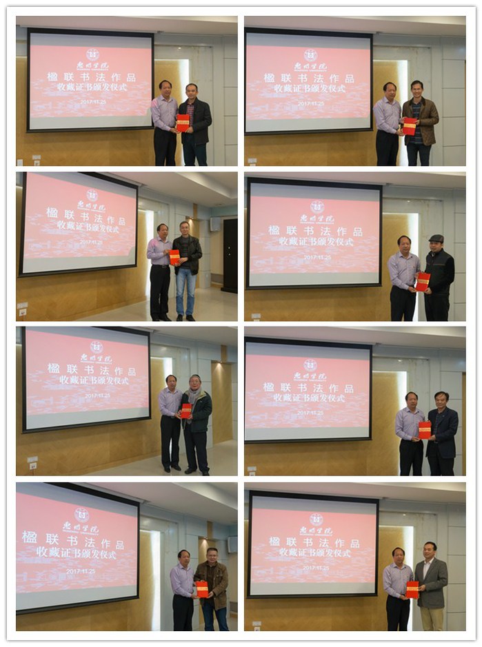 本网讯 11月25日,是我校建校71周年暨首个校友返校日。为了感谢在我校70周年校庆楹联书写征集活动中作出贡献的书法家、校友,学校在行政楼202会议室举行惠州学院楹联书法作品收藏证书颁发及校园书刻艺术画册发布仪式。校党委副书记赵日兴,我校文学与传媒学院退休教师刘奇星、惠州文广新局副调研员李杰、中国书法家协会会员赵玄、中国硬笔书法家协会会员沈水松、惠城区文联主席胡淑景、中国书法家协会会员吴鸿发、广东省书法家协会会员林香扬等嘉宾,党委宣传部负责人,旭日广东服装学院党总支书记曾裕林,学校书法协会和部分学院的学生代表近40人出席了本次活动。