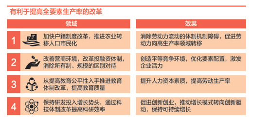 消除生产要素自由流动的体制机制障碍。其中,户籍制度改革红利最明显。加快户籍制度改革,推进农民工市民化,可以促进劳动力从低生产率领域向高生产率领域转移,优化资源配置,进而提高全要素生产率。我们研究表明,从劳动力流动中每获得一个百分点的全要素生产率改进,可以实现同等幅度的经济增长率提高。