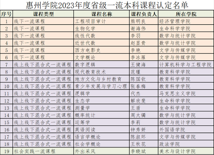本网讯 近日,广东省教育厅公布了2023年度省级一流本科课程认定结果,我校一流本科课程建设再创佳绩,共有19门课程获得认定,其中线下一流课程6门、线上线下混合式一流课程12门、社会实践一流课程1门。截至目前,我校共有国家级、省级一流本科课程51门,获批总数位列省内同类院校前列。
