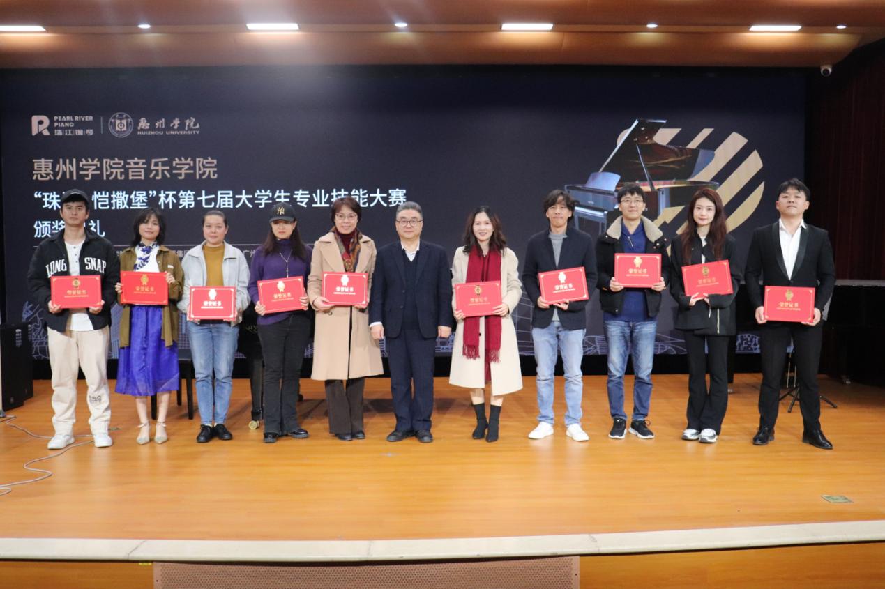 12月28日下午,音乐学院第七届“珠江·恺撒堡”杯四项技能大赛颁奖典礼暨音乐会在音乐楼排演厅举行,校党委副书记、纪委书记、省监委驻惠州学院监察专员罗川山,广州珠江恺撒堡钢琴有限公司副总经理贺相宜、珠江钢琴惠州总代理杨飞,音乐学院领导班子成员和师生代表近200人参加了本次音乐会。在恺撒堡奖学金颁奖环节,校党委副书记罗川山和企业代表、音乐学院领导班子为获奖师生颁发了证书。