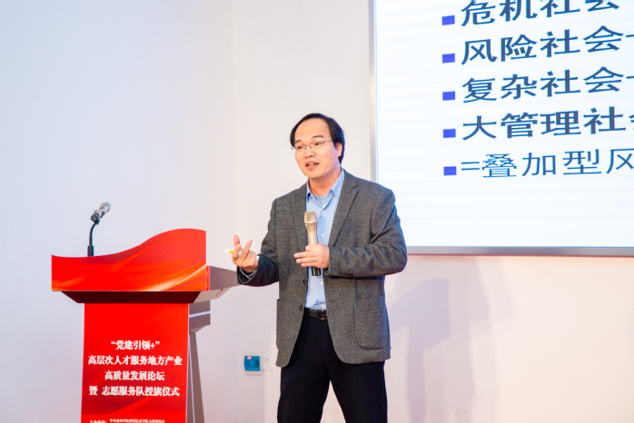 会议第二阶段,在“党建引领+”高层次人才服务地方产业高质量发展论坛中,高层次人才志愿服务队队长、惠州学院仲恺信息学院党支部书记黄剑锋详细介绍了志愿服务队依托党建工作、高层次人才助力地方产业高质量发展的具体思路;亿兆能源总经理王震宇、惠州市德钢技术有限公司派驻博士汪成龙也就各自研究领域实现党建引领、高层次人才赋能进行了分享。论坛中特邀嘉宾暨南大学应急管理学院李伟权教授,围绕“新兴产业发展背景下的安全生产与应急管理挑战”开展了主题宣讲。