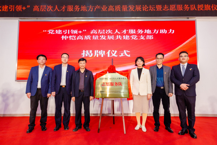 随后,惠州学院机关党委书记邓淑容、电子信息与电气工程学院党总支书记谭润志、惠州市惠企邦企业管理有限公司党支部书记陈书宗、仲恺高新区惠环街道党工委书记杨鸿辉、区党建工作办公室副主任阳国龙、区社会事务管理局党组成员、社会组织党委副书记赖阳辉一同为“党建引领+”高层次人才服务地方志愿服务队揭牌。