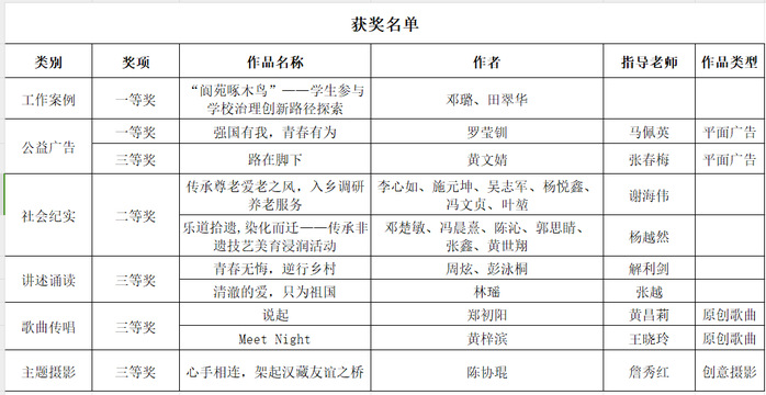 本网讯 近日,广东省教育厅公布了“习近平总书记与大学生在一起”学习分享活动暨2023年“立志·修身·博学·报国”主题教育系列活动评选结果,我校在本次活动中喜获工作案例类作品一等奖1项,公益广告类作品一等奖1项、三等奖1项,社会纪实类作品二等奖2项,讲述诵读类作品三等奖2项,歌曲传唱类作品三等奖2项,主题摄影类作品三等奖1项。