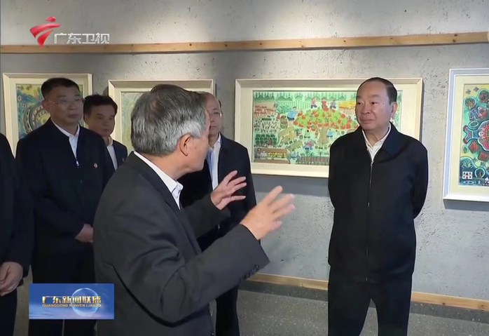 本网讯 近日,省委书记黄坤明来到惠州市龙门县,走进乡镇农村、产业园区、种植基地、自然保护区和生态治理项目,围绕贯彻落实习近平总书记视察广东重要讲话、重要指示精神,聚焦推进“百千万工程”这一广东高质量发展的“头号工程”进行专题调研。期间在龙门县城西村农民工匠协会科普馆调研时,我校兼职教授、惠州龙门农民画非遗传承人王汉池向黄坤明详细讲解了广东传统民俗绘画艺术—龙门农民画的主题思想和艺术特征,并就其中几幅代表作所表达的意境现场即兴唱起客家山歌。
