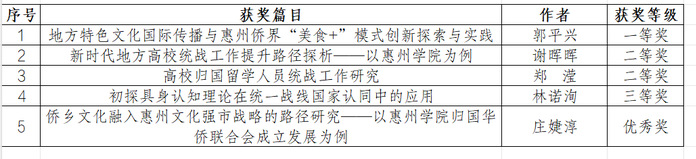 本网讯 2月29日上午,2024年全市统战部长会议在惠州市行政中心召开,会上通报了2023年度全市统战理论创新成果评比结果。在此次评选中,我校郭平兴、谢晖晖、郑滢、林诺洵、庄婕淳等5名教师提交的研究成果受到表彰,其中一等奖1项、二等奖2项、三等奖1项,优秀奖1项。