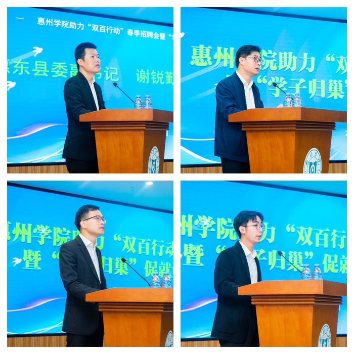 本网讯 为进一步推进百校联百县助力“百县千镇万村高质量发展工程”行动(以下简称“双百行动”)走深走实,有效搭建校地协同联动平台,号召广大学子助力“百千万工程”回乡就业创业、建功家乡,助力2024届毕业生高质量就业,3月22日,惠州学院举办“助力‘双百行动’春季招聘会暨‘学子归巢’促就业”专项行动。惠东县县委副书记、县长陈广文,和平县县委副书记、县长张衍彪,惠州市人才交流服务中心主任黄三元,河源市教育局党组成员、副局长钟小明,惠东县委副书记谢锐勤,和平县委常委、宣传部部长邝茂华,惠州学院党委书记彭永宏,党委副书记车小真等出席活动。