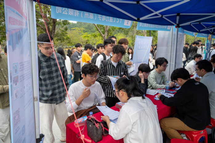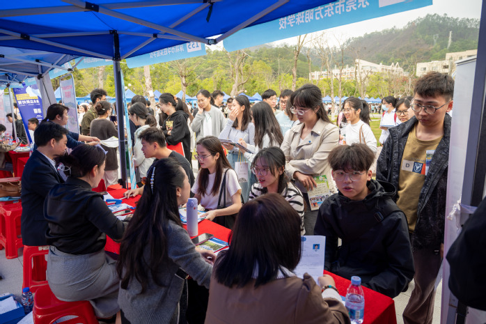 招聘会现场人潮涌动。毕业生们积极投递简历,就任职要求、工作内容、发展前景、薪酬福利等情况,与用人单位进行深入的沟通交流,期待与心仪的用人单位实现“双向奔赴”。本场招聘会依托惠州学院就业网平台,采取线上线下一体化方式进行,聚焦电子产业、化工能源、绿色科技等产业发展,共吸引了近300家用人单位参加,招聘需求人数达万余人。