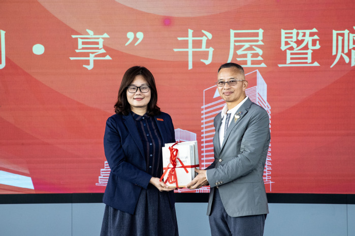 车小真代表学校向惠州学院-惠州天安数码城“创·享”书屋捐赠图书并讲话。她指出,惠州学院与惠州天安数码城发展契合点多,共赢空间广阔,合作前景可期,希望双方按照协议约定,持续推进党建共建、人才培养、科学研究、创新创业、企业服务等领域务实合作,充分发挥创新主导作用,以科技创新推动产业创新,加快发展新质生产力。经济管理学院要依托自身特色优势,用好现有科研平台,加强与企业对接交流,找准合作突破口,由点及面实现深度融合,打造校企合作共赢新典范。