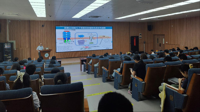 刘俊教授作题为“植物天然免疫信号转导--细胞的生死抉择”讲座。他以植物与微生物战争中的“攻”与“防”为引,生动形象地向大家介绍了植物巧妙构筑的两道免疫防线“PTI”和“ETI”,并指出磷酸化调控在植物免疫信号中的重要作用。同时,刘俊教授还从酪氨酸磷酸化动态调控在植物免疫方面的功能以及MAPK级联信号通路关键因子在免疫中的作用方面分别向大家分享了近些年取得的科研成果。