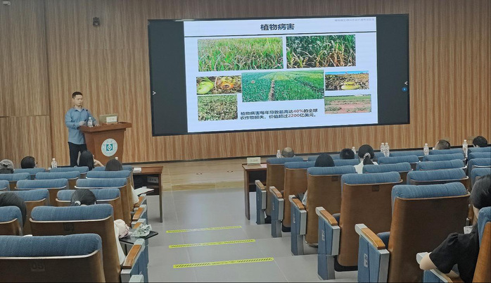 李剑峰作题为“真菌几丁质触发的植物免疫信号转导”讲座。讲座中,他介绍了病原菌对植物生长发育的影响,指出真菌病害是作物产量损失严重的因素之一,提到抗病分子育种是作物抗病最高效、持久、环保的手段。李剑峰表示,技术的突破在助力科学研究中起着关键的作用。他还分别从“植物细胞因子PROPEP如何加工成熟”“植物真菌和细菌信号通路是否存在互作”和“几丁质受体下游是否存在未知新通路”三方面对近年来所取得的研究进展进行了分享交流。