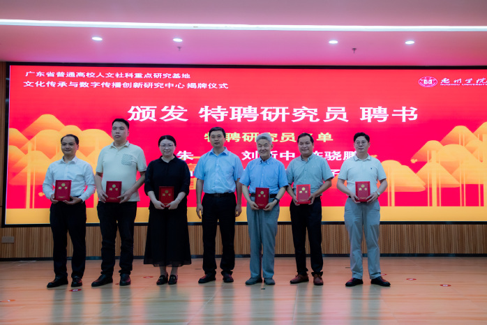 惠州学院校长王胜、华南农业大学党委书记李凤亮、原惠州学院党委副书记罗川山、惠州学院副校长魏晓慧、惠州学院科学技术部部长刘国聪、惠州学院文学与传媒学院院长陈梦共同为文化传承与数字传播创新研究中心揭牌。
