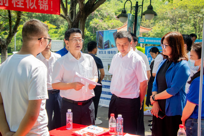 本网讯 为充分发挥党建引领作用,助力惠州市社会组织及企业用工需求和我校毕业生的求职需求双方的精准对接,为毕业生就业提供充足岗位,同时为惠州市社会组织及企业用工高质量发展提供人才支撑,5月17日,我校联合惠州市民政局、惠州市人力资源和社会保障局和仲恺高新区管理委员会社会事务局等单位,在学校诚意路举办“党建引领稳岗就业助力高质量发展暨惠州市社会组织及企业助力就业用工供需对接会”。惠州市副市长于加良,市民政局副局长、二级巡视员何顾全,市民政局党组成员、市社会组织党委专职副书记邓文汉,仲恺高新区社会事务管理局党组书记、局长叶永宁,惠州学院校长王胜,惠州学院党委副书记车小真等莅临招聘会现场并指导工作。