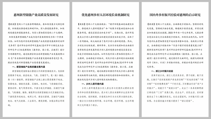 《国内外乡村振兴经验对惠州的启示研究》报告提出“一二三产业融合式六次产业、特色农业向品牌化农业转化、实现可持续发展目标(SDGs)”等经验创新建议;《优化惠州乡村人居环境长效机制研究》报告提出“自然环境、社会环境、经济环境、生态环境和文化环境的体系一体化构建”等优化建议;《惠州新型储能产业高质量发展研究》报告提出“以创新为动力,实现绿色、协调、开放、发展”等路线图建议。