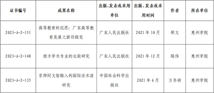 本网讯 近日,广东省人民政府公布了《关于颁发第十届广东省哲学社会科学优秀成果奖的通报》,我校副校长郑文教授的研究成果《高等教育的沉思:广东高等教育发展之新径探究》、教育科学学院学科带头人陈伟教授的研究成果《西方学术专业的比较研究》、政法学院万齐洲教授的研究成果《京师同文馆输入的国际法术语研究》分别荣获广东省哲学社会科学优秀成果奖二等奖。