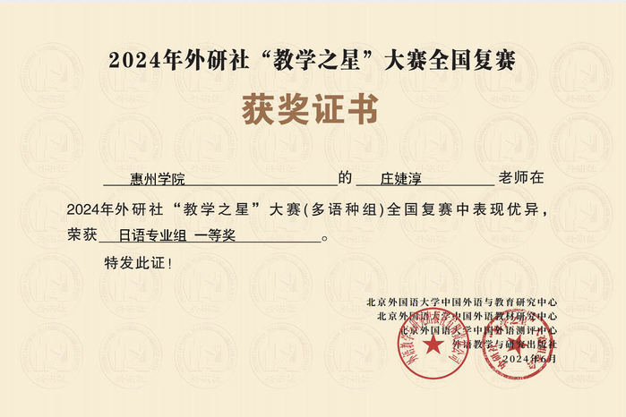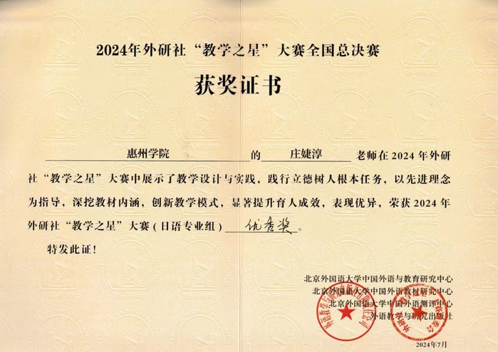 本网讯 近日,2024年外研社“教学之星”大赛日语组全国总决赛颁奖典礼在黑龙江哈尔滨举行,我校外国语学院日语系教师庄婕淳荣获全国复赛一等奖、全国决赛优秀奖。