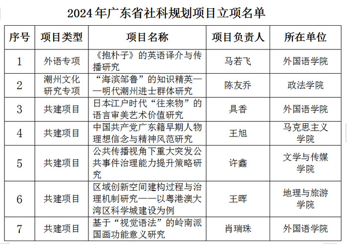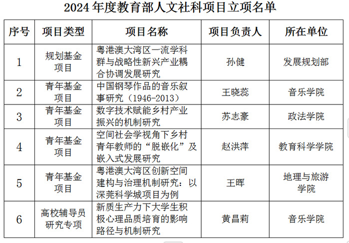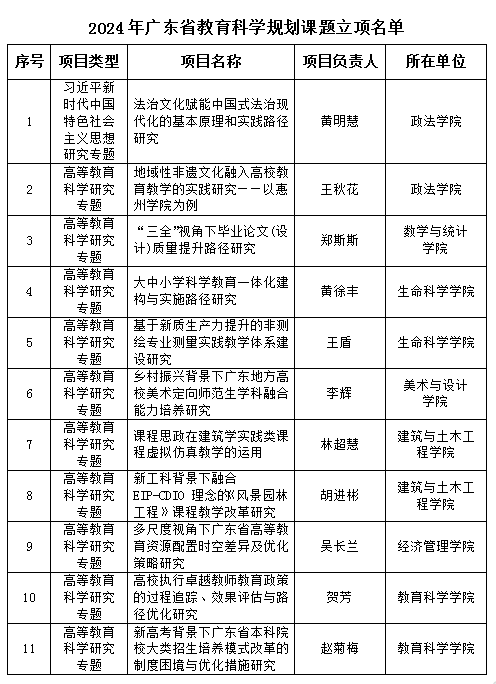 本网讯 近日,一批国家级、部级、省级、市厅级项目立项和公示名单先后公布。截止到2024年8月30日,我校获批各级各类纵向科研项目达124项。其中:国家自然科学基金项目6项、教育部人文社科项目6项,广东省哲学社会科学规划项目7项、广东省教育科学规划课题11项、广东省教育厅高等学校科研平台和项目9项、惠州市社科规划项目85项。厅级以上立项项目名单详见各项列表: