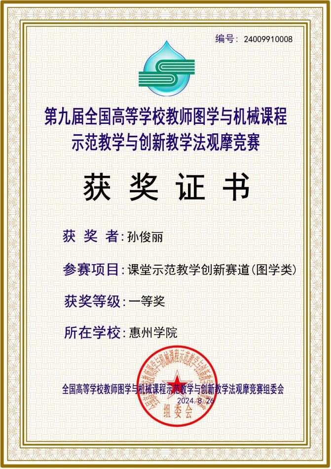 本网讯 8月23日至26日,第九届全国高等学校教师图学与机械课程示范教学与创新教学法观摩竞赛在山东济南举行,我校电子信息与电气工程学院孙俊丽老师荣获课堂示范教学创新赛道(图学类)全国一等奖。