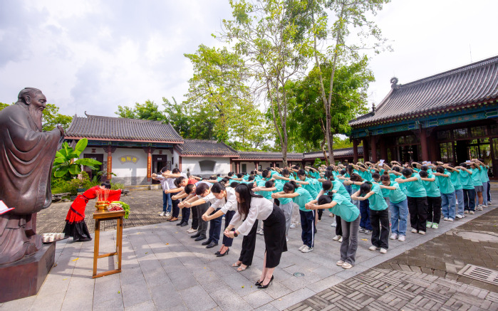 在拜师礼环节,师生一行来到孔子像前,行庄严而神圣的拜师礼,旨在传承尊师重教的优良传统,让新生“亲其师、信其教”。现场,师生肃然而立,揖手鞠躬敬行拜先师之礼。随后,学子呈递拜师帖、行拜师礼,并聆听老师训诫。拜师礼成,一段师徒之缘就此开启,师生共同踏上探寻真知、真理的新征程。