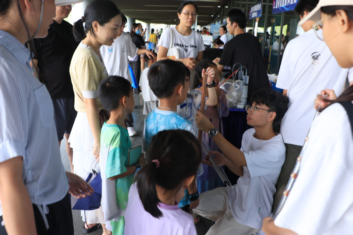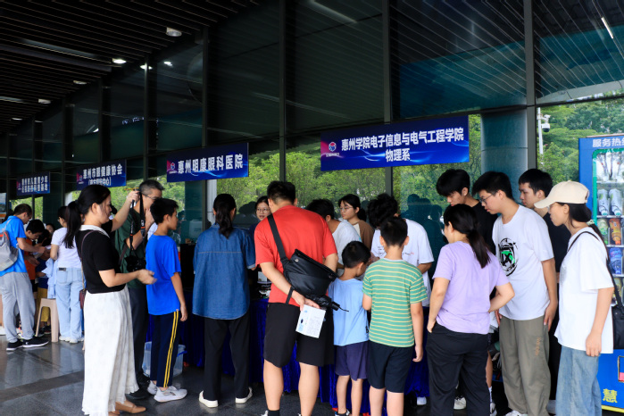 本网讯 为贯彻落实全国科技大会、国家科学技术奖励大会、两院院士大会精神,激发青少年的科技兴趣,筑牢科技创新的群众基础,9月22日由惠州市科协、惠城区科协在惠州科技馆联合举办以“提升全民科学素质 协力建设科技强国”为主题的科普日活动(科普集市),我校师生携光的波动演示仪、声音的可视化展示仪、模拟近视眼和远视眼的实验装置,以及电磁感应小火车等自主研发的创新性教具亮相本次科普集市活动。