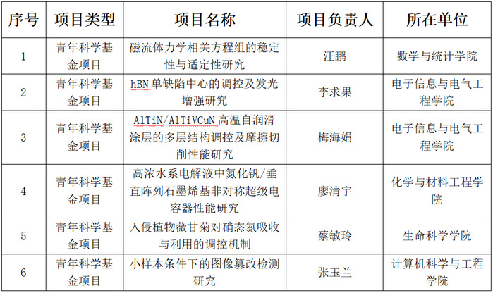 本网讯 近日,国家自然科学基金委员会正式公布了2024年度立项项目清单,我校共有6个项目获得资助。