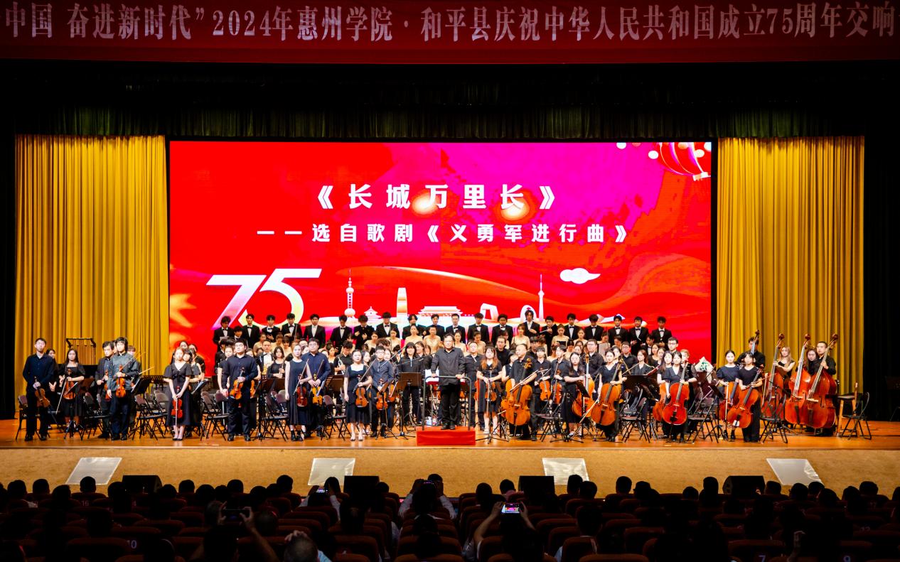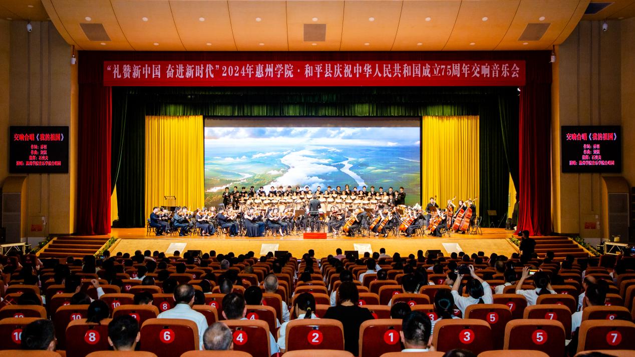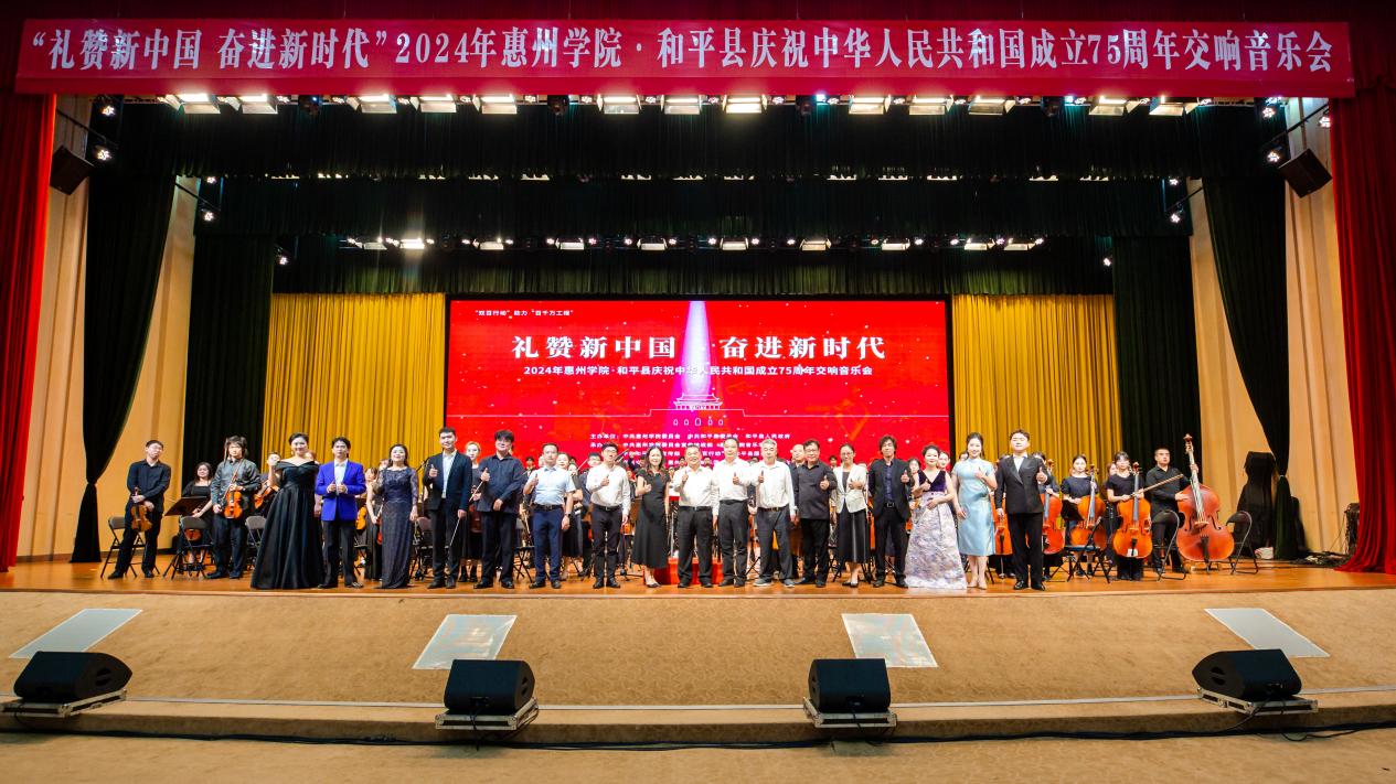 本网讯 七十五载岁月如歌,砥砺前行共谱新篇。为庆祝中华人民共和国成立75周年,我校携手河源市和平县委县政府,于9月27日在和平县政务中心影剧院倾情打造“礼赞新中国、奋进新时代”2024年惠州学院·和平县庆祝中华人民共和国成立75周年交响音乐会。惠州学院交响乐团、合唱团近200名师生奔赴共建县域一线,奏响了“双百行动”校地共建新篇。