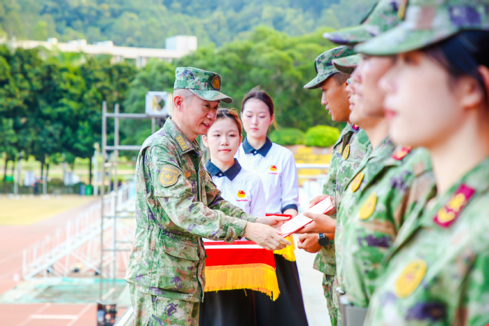 副校长魏晓慧宣读表彰决定,对军训期间表现突出的优秀集体和先进个人进行了表彰,校领导及惠州军分区大校司令员张军为获奖单位及优秀个人颁奖。