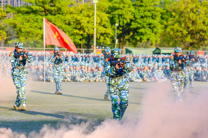 在军事训练成果汇报表演环节,分列式、军体拳、刺杀操、擒敌拳、卫生救护、匕首操、战术基础防暴队形综合演练等科目精彩亮相,充分展示了参训学生的铿锵斗志和良好的军事能力。