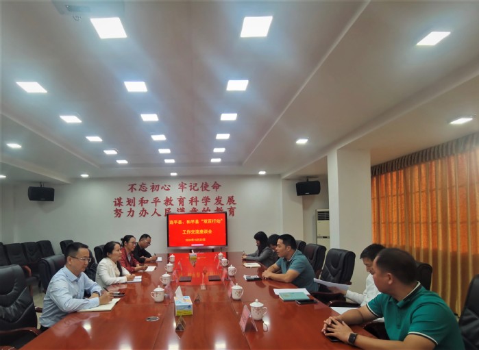 本网讯 10月23日,“双百行动”高校驻连平县服务队队长黄子嵩、副队长栾飞,连平县教育局副局长朱团兴一行到和平县开展工作交流,共同探讨“双百行动”的有效路径和先进经验方法。“双百行动”高校驻和平县服务队队长张莉琼、副队长陈朝萌、和平县教育局副局长骆婵等参加交流会。