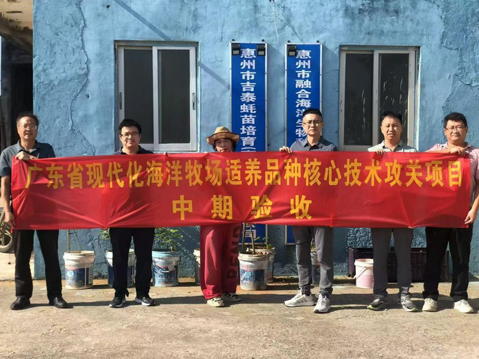 牡蛎苗种在惠州市吉泰蚝苗培育基地有限公司(惠来基地)进行孵化培育,长大到0.1-0.2cm时,运输到惠东县赤岸村进行海上吊养,验收专家对海上吊养的牡蛎进行现场测产。