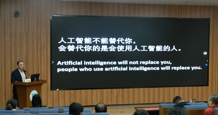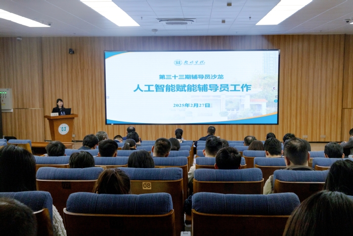 本网讯 人工智能技术的飞速发展,为学生管理和教育工作带来了新的机遇与挑战。为提升辅导员运用人工智能技术的能力,推动学生工作科学化、智能化发展,2月27日下午,我校在旭日科技大楼A座302报告厅举办第三十三期辅导员沙龙,计算机科学与工程学院王健海老师受邀作“人工智能赋能辅导员工作”主题分享。学生工作部、校团委全体人员,各二级学院党委副书记、全体辅导员参加沙龙培训。
