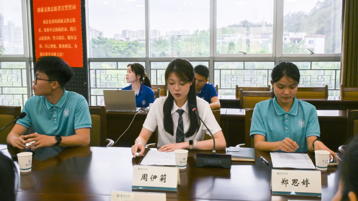 生命科学学院周伊莉同学代表我校第十三、十四批援藏支教队汇报2024年教育援藏情况。数学与统计学院郑思婷同学作为第十五批支教队队长发言,她表示,全体队员将带着责任与使命,带着爱与希望,为朗县基础教育事业贡献青春力量,共同讲好惠院学子援藏故事。