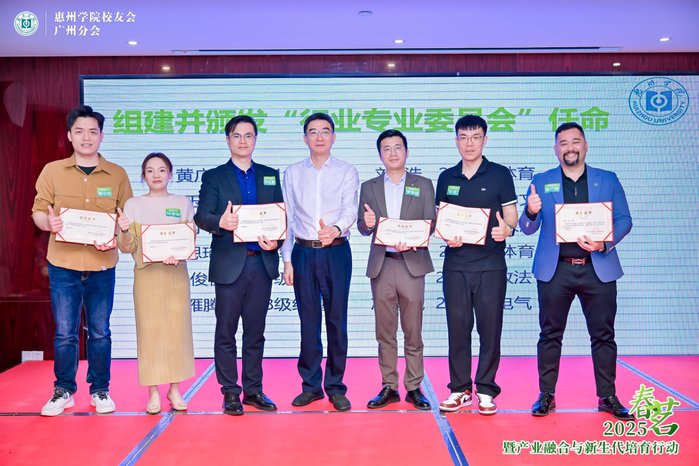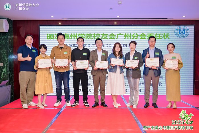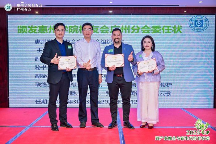 会上颁发了广州分会2024年度“突出贡献奖”,以及广州分会“行业专业委员会”任命书、“惠州学院校友会广州分会委任状”等证书。