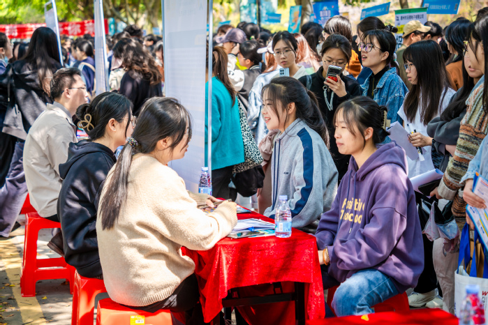 诚意路校道气氛热烈,众多毕业生手持简历,穿梭于各个企业展位之间,积极与招聘人员交流,了解企业的招聘需求、岗位详情、职业发展路径以及薪资待遇等信息,争取获得心仪的工作岗位。