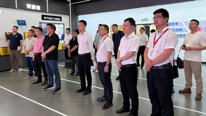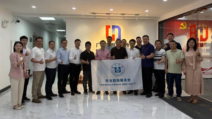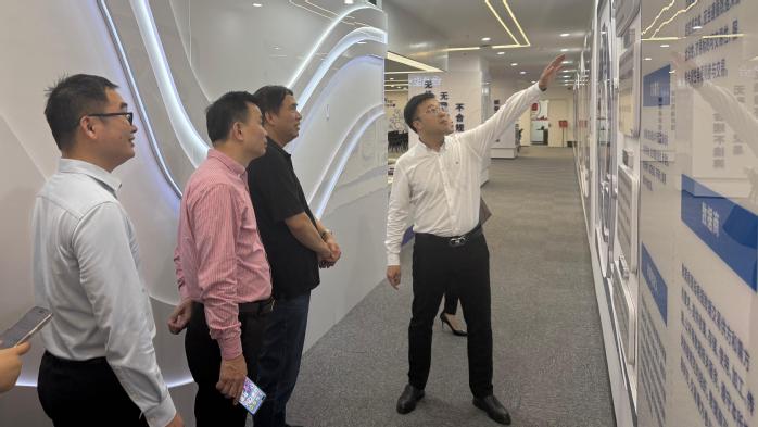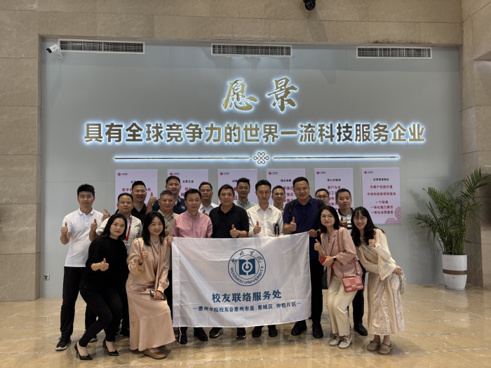 随后,刘国栋一行来到惠州市智慧大数据有限公司,受到公司党支部书记、副总经理毛有龙和基地运营负责人、我校2009届校友温伟的热情接待。温伟陪同校领导、校友联络服务处校友代表参观了惠州服务基地展厅,并介绍了基地运营情况、公司发展历程与战略定位。