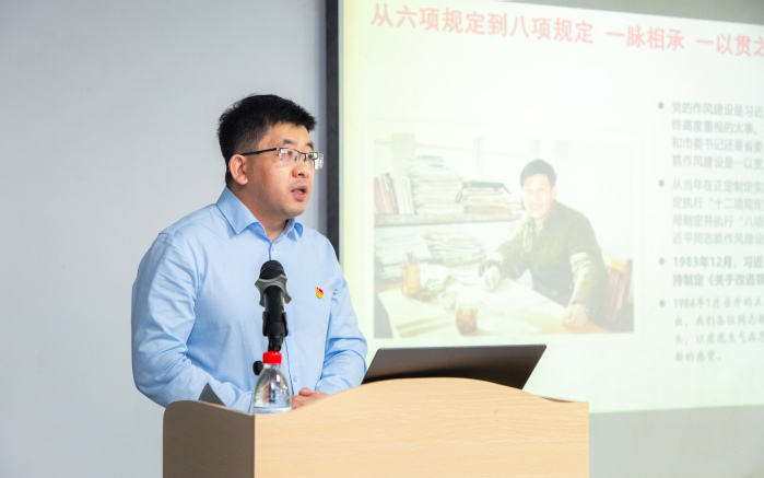 广东省党建工作样板支部、政法学院教工第二党支部书记李博强作《清风正气满乾坤——习近平总书记引领全党锲而不舍贯彻落实中央八项规定精神》专题微党课。他指出,以习近平同志为核心的党中央坚持不懈推进中央八项规定精神贯彻落实,各位党员师生干部要进一步坚定理想信念,增强宗旨意识。