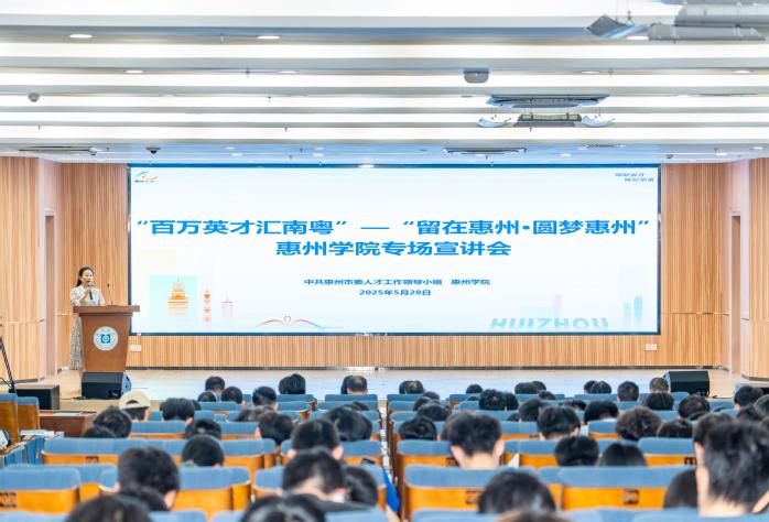 本网讯 为全面落实广东省委、省政府关于“百万英才汇南粤”行动计划部署要求,更好促进本地高校毕业生高质量就业,5月28日下午,惠州市委组织部在我校旭日科技大楼A座201报告厅举办“留在惠州·圆梦惠州”惠州学院专场宣讲会。惠州学院副校长魏晓慧,惠州市委组织部副部长、市人才工作局局长张龙,市委组织部人才二科科长高键勇,胜宏科技(惠州)股份有限公司行政管理中心总监、党委副书记张如萍,惠州市环两山投资开发有限公司总经理李玉璘,惠州市高悦高心理咨询有限公司总经理林悦,惠州飞飞教育科技有限公司总经理吴志鑫,惠州学院学生工作部负责人、二级学院党委副书记、辅导员代表、2025届、2026届毕业生代表参加了此次宣讲会。