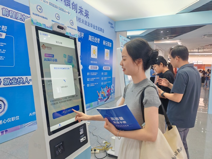 本次招聘会特别设置的“AI赋能就业”区,成为现场一大亮点。毕业生通过AI求职服务自助机,可以快速完成自我评测、简历诊断、岗位精准匹配等服务,有效提升了求职效率与成功率。现场不少毕业生借助设备实现与企业岗位的精准匹配。