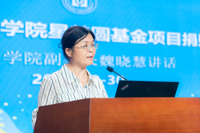 魏晓慧代表学校向广州星梦圆文化艺术有限公司的善举表示衷心感谢。她指出,校友企业的捐赠不仅体现了企业家反哺社会、支持教育的责任担当,更是对学校办学成果与发展前景的充分肯定,为师生树立了感恩奉献、回馈社会的榜样。她简要介绍了学校近年来在提升办学层次、深化产教融合方面取得的进展,并强调,“星梦圆基金”的设立将为音乐学院的内涵建设注入新动力,是推进校企协同育人、共促高质量发展的良好开端。